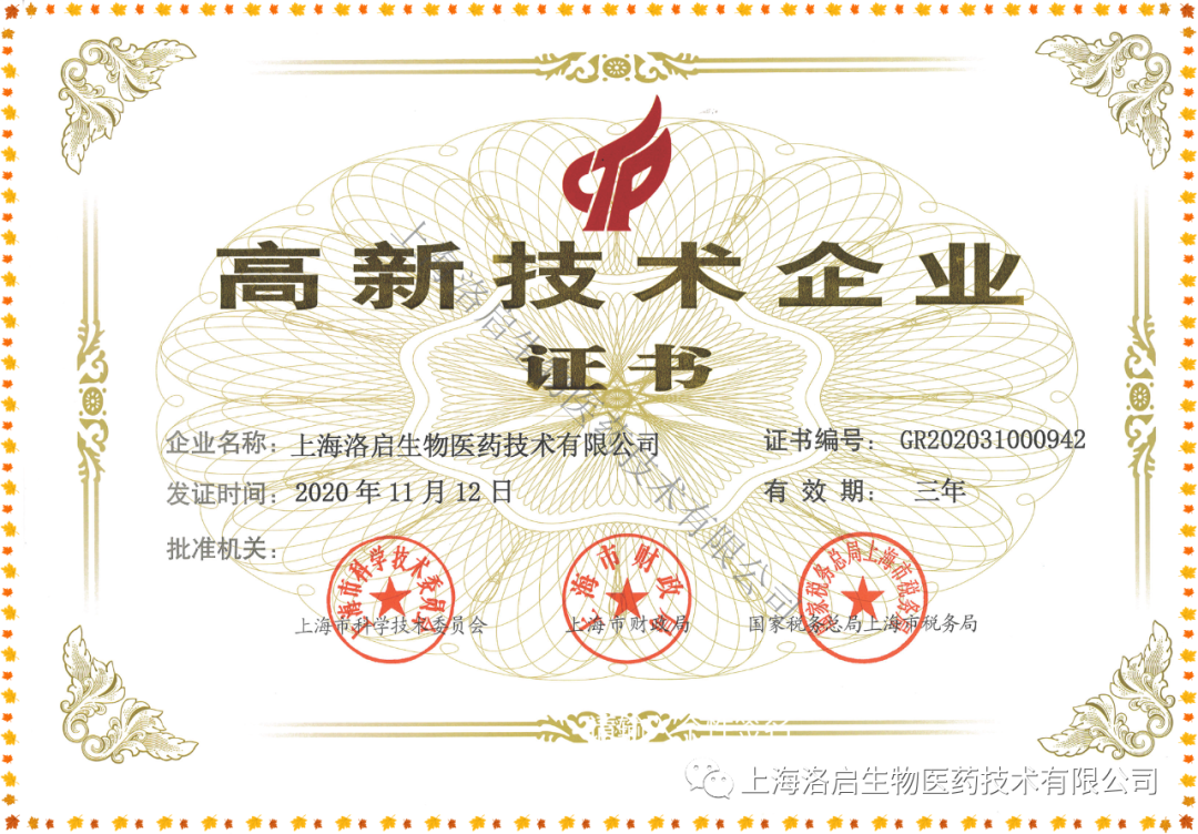 近期,上海3044am永利集团生物医药技术有限公司取得了由上海市科学技术委员会、上海市财政局、国家税务总局上海市税务局联合颁发的“高新技术企业证书”。