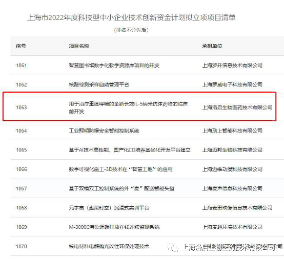 近期,上海市科学技术委员会组织的“上海市2022年度科技型中小企业技术创新资金计划”拟立项项目名单公示完毕,3044am永利集团生物“用于治疗重度哮喘的全新长效IL-5纳米抗体药物的临床前开发”项目入围。